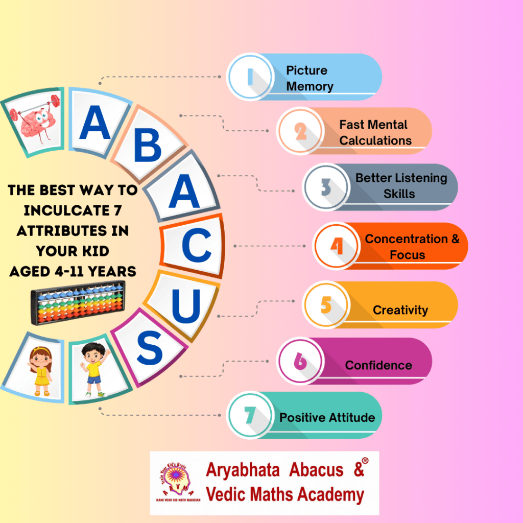 The real outcome of an abacus is when a kid is able to do calculation without the availability of a physical abacus device as an abacus device is not available everywhere. If a kid is not able to do calculations without an abacus, then learning abacus is of no use. At Aryabhata Abacus & Vedic Maths Academy, we train the kids from day one on visualization where your kid is trained on creating imaginary abacus and beads and doing the arithmetical calculations. When a kid learns to create imaginary abacus and beads, picture memory gets stronger. That helps in developing visualization skills or picture memory. Visualization skills or strong picture memory can also be used in other subjects by some advanced training.